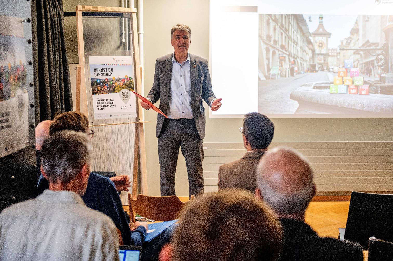 Stadtpräsident Alec von Graffenried zeigte, wie die SDG als Grundlage für die Rahmenstrategie Nachhaltige Entwicklung der Stadt Bern den Weg in eine nachhaltige Zukunft weisen.