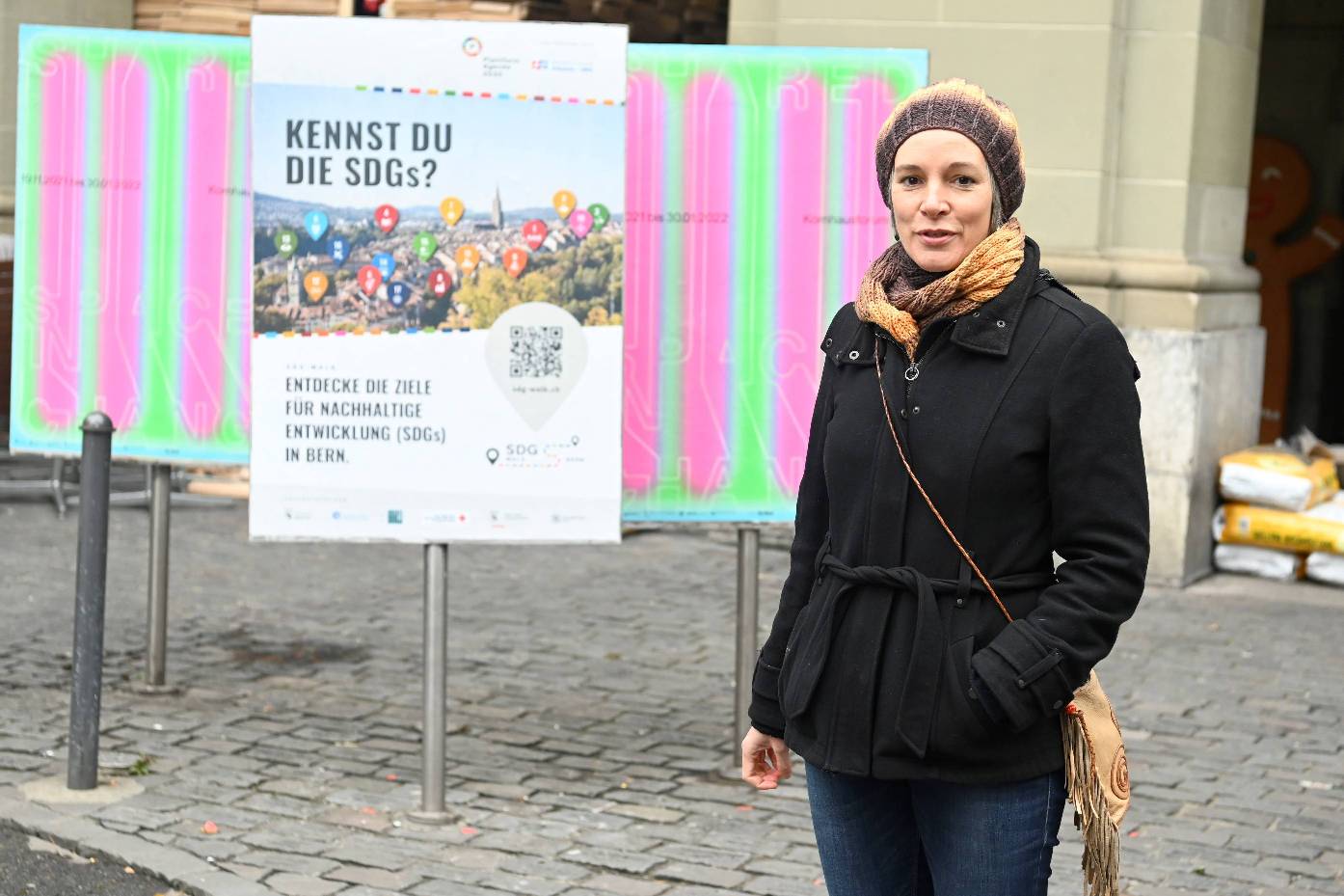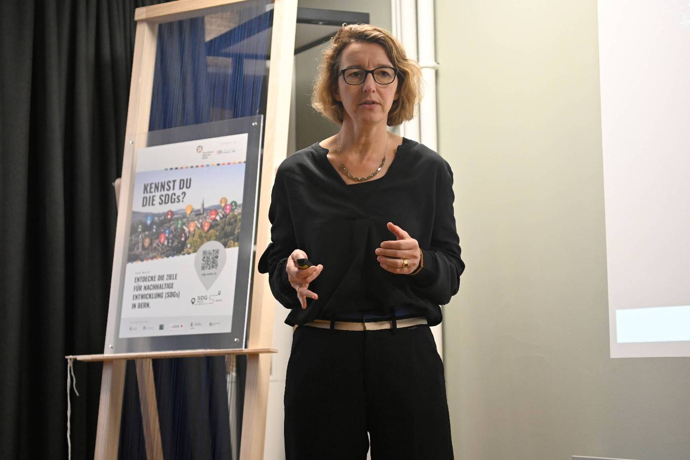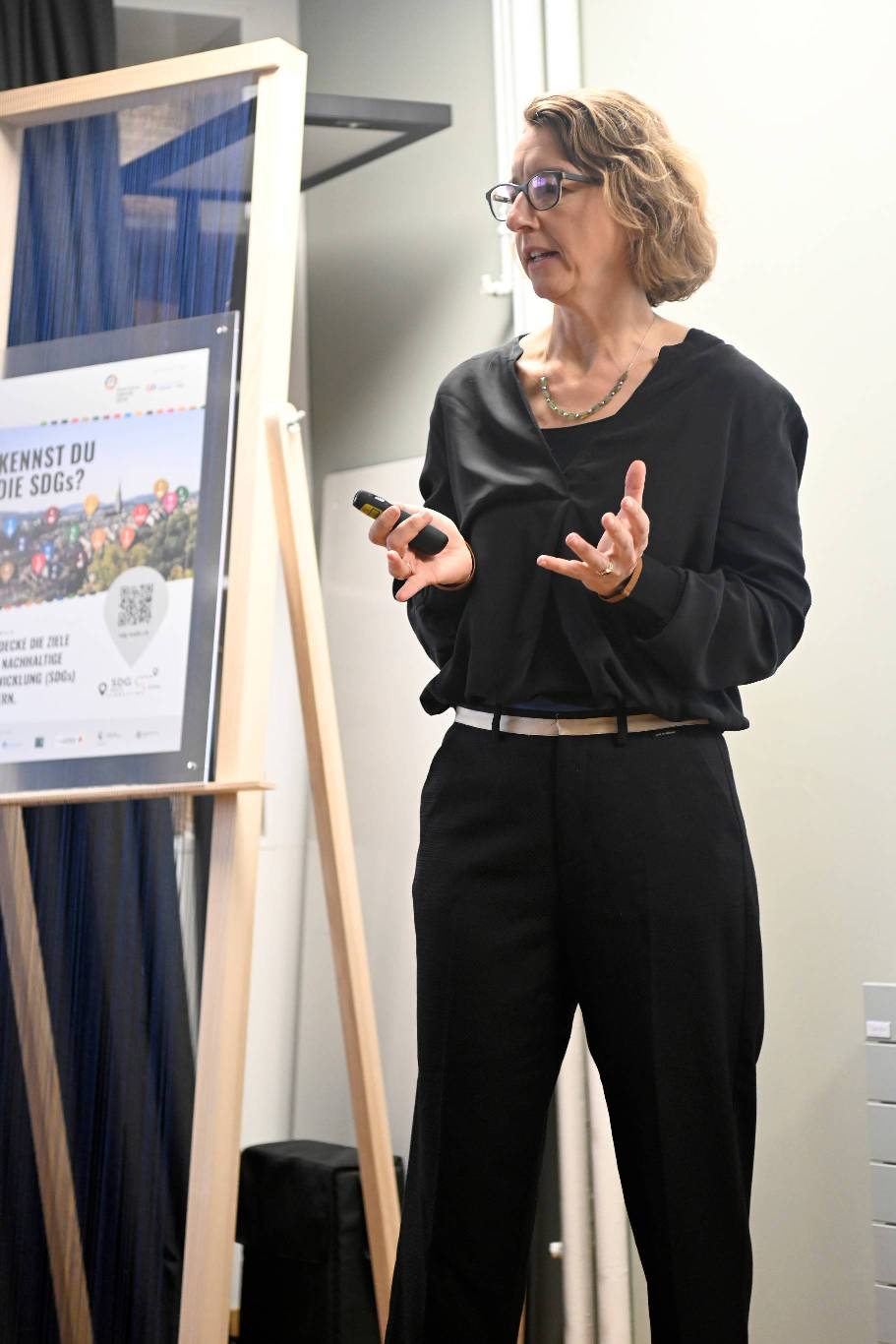 Eva Schmassmann, Geschäftsführerin der Plattform Agenda 2030, präsentiert den SDG Walk.