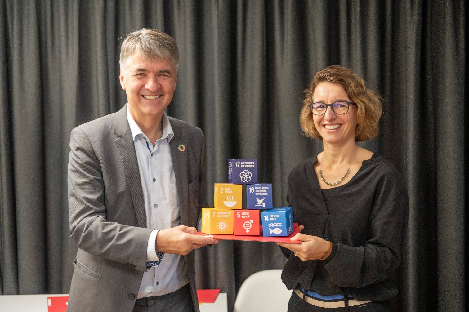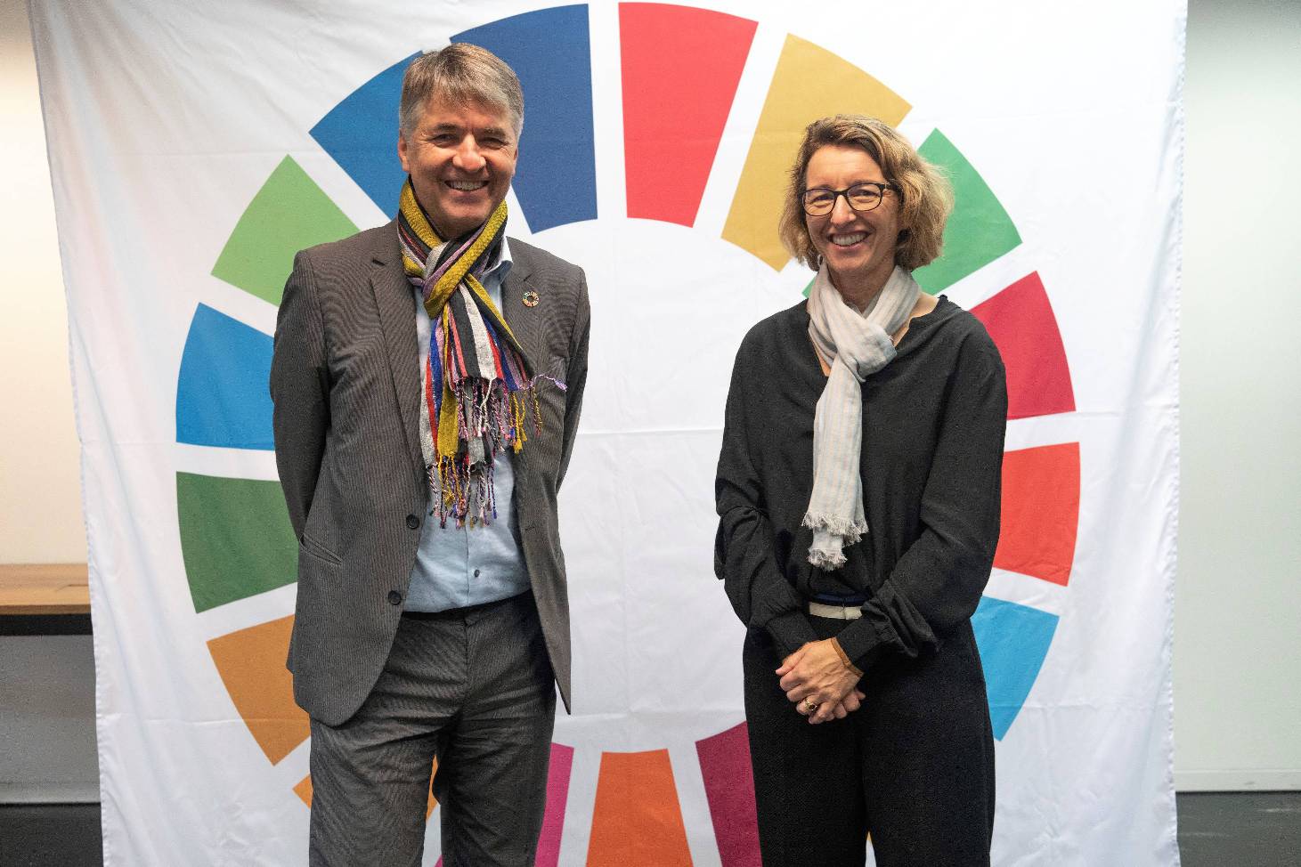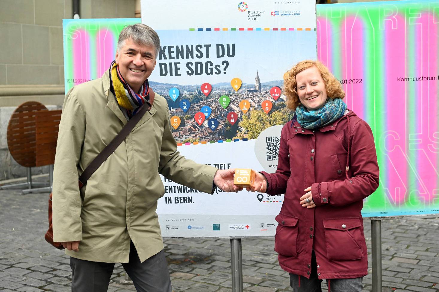 Stadtpräsident Alec von Graffenried und Tatjana von Steiger, Wyss Academy, an der Lancierung des SDG Walks