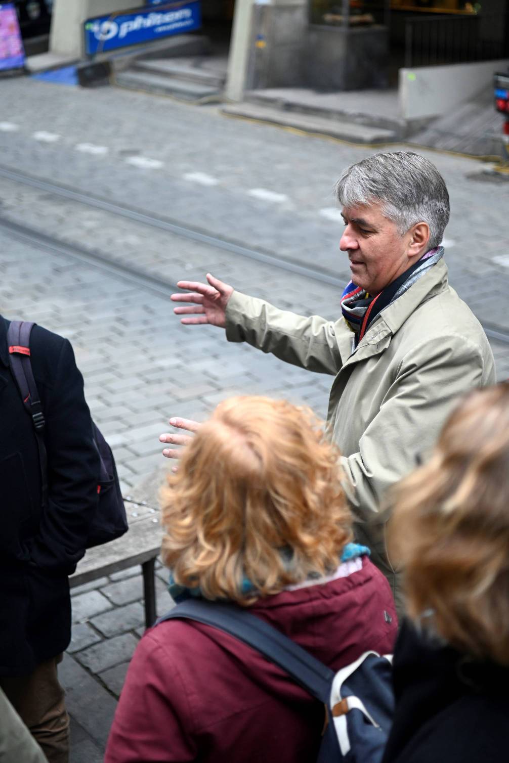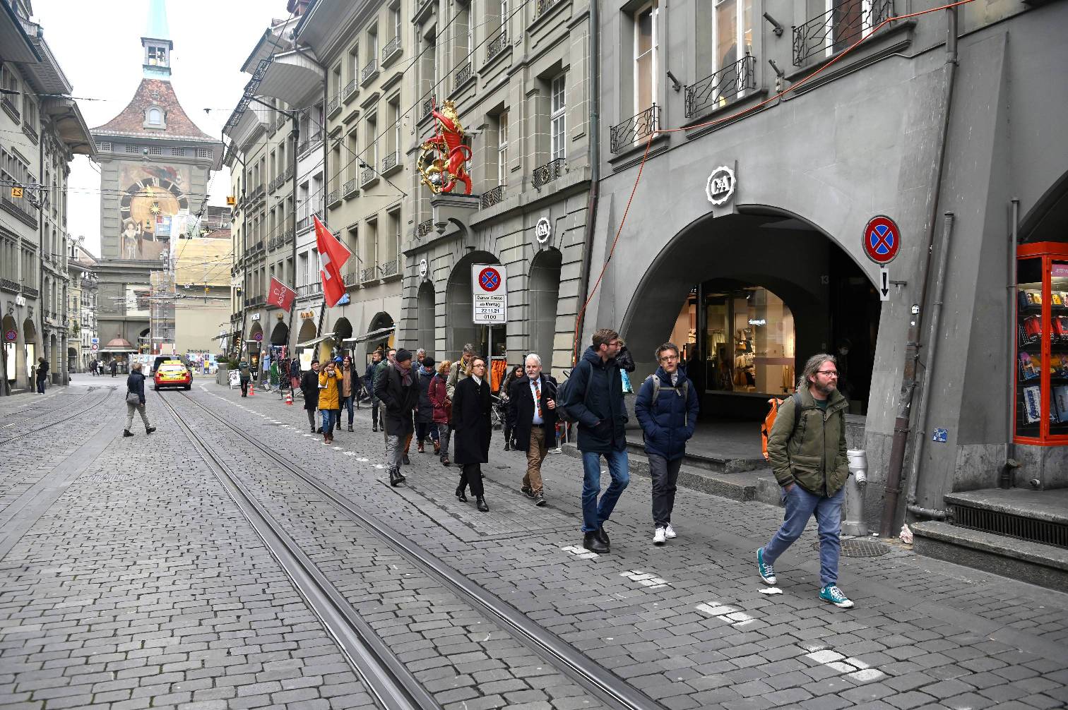 Während des ersten SDG Walks durch die Altstadt spricht Alec von Graffenried zu food waste in der Stadt Bern.